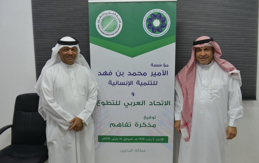 وجرى توقيع الاتفاقية مؤخراً، في مقر الاتحاد بمملكة البحرين، بحضور أمين عام الاتحاد العربي للتطوع، عبدالرزاق المريسي، ومدير إدارة العلاقات العامة والإعلام في مؤسسة الأمير محمد بن فهد للتنمية الإنسانية، الدكتور فيصل العنزي، وعدد من أعضاء مجلس إدارة جمعية الكلمة الطيبة، وأعضاء من المؤسسة.